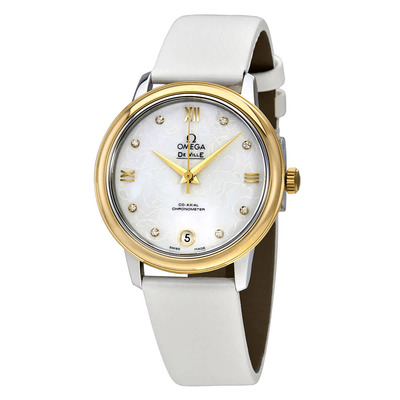 Silver-tone stainless steel case with white satin leather strap and an 18kt yellow gold fixed bezel. Features a mother-of-pearl butterfly dial accented by Roman numeral hour markers at the 3, 9, and 12 o'clock positions, along with gold-tone dauphine-style hands displaying analog functions including hours, minutes, seconds, date (at 6 o'clock). Powered by Omega Calibre 2500 automatic movement based on ETA 2892-A2, equipped with 27 jewels, a chronometer rating at 25200 vph (bits), and approximately 48 hours power reserve. Includes co-axial escapement technology, scratch-resistant sapphire crystal glass, pull/push crown, solid case back, round case shape measuring 32.7 mm diameter and 9.5 mm thickness, band width of 16 mm, tang clasp system, water resistance to 30 meters (approx. 100 feet). Swiss Made.
