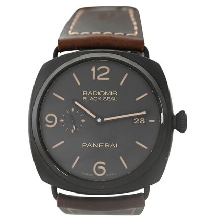 Pre-owned analog Swiss made watch with black composite ceramic case, brown leather strap. Fixed black ceramic bezel. Brown dial featuring luminous hands and index hour markers including Arabic numerals at 6,9,12 o'clock positions. Date display at the 3 o'clock position. Small seconds sub-dial at the 9 o'clock position. Powered by Panerai Calibre P.9000 automatic movement with 28 jewels, composed of 197 parts, beating at 28800 vph, offering a 72-hour power reserve. Equipped with sapphire crystal for scratch resistance and screw down crown. Comes with see-through case back. Features cushion case shape measuring 45 mm in size and tang clasp. Water resistant to 100 meters / 330 feet.