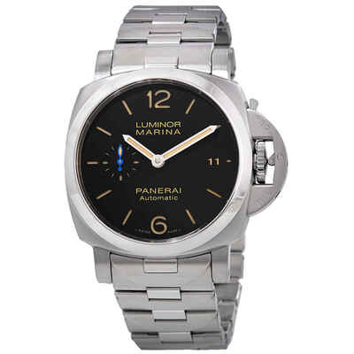 Silver-tone stainless steel case and bracelet, fixed silver-tone bezel, black dial with luminous hands and index markers including Arabic numerals at the 6 and 12 o'clock positions. Analog dial type features luminescent hands and markers. Date display located at the 3 o'clock position. Additional subdial indicates small seconds. Equipped with Panerai Calibre P.9010 automatic movement, featuring a 31 jewel composition from approximately 200 parts, beating at 28800 vph, and offering an approximate power reserve of 72 hours. Protected by a scratch-resistant sapphire crystal. Crown is push-lock type. Transparent case back included. Watch features a cushion shape with dimensions: 42mm diameter, 13.2mm thickness. Stainless steel bracelet measures 22mm in width secured using a deployment clasp with push button activation for release. Water resistance to depths of 30 meters (100 feet) or up to 300 meters / 1000 feet according to specification, functions include hour, minute, second and date display via subdials. Style: Luxury watch; Collection/Category: Luminor Marina 1950 Series; Label/Made: Swiss Made.