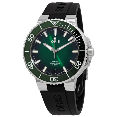 Analog Swiss Made men's dive watch featuring a green dial, luminous hands and markers, date display at the 6 o'clock position. Equipped with an automatic movement (Calibre 400) containing 21 jewels and offering approximately 120 hours power reserve. Includes unidirectional rotating stainless steel bezel with an inlaid green ring, scratch resistant sapphire crystal lens, screw down crown for water resistance up to 300 meters / 1000 feet, transparent case back, round case size 41.5 mm, black rubber strap width 22 mm with fold over clasp.