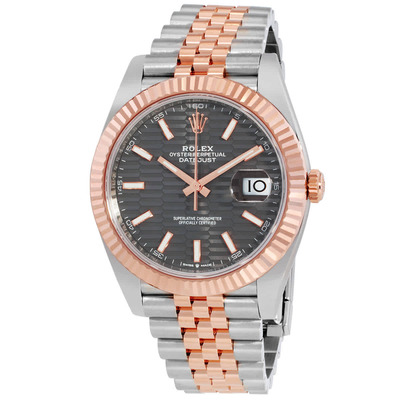 Automatic analog watch with date function. Steel and everose gold case, steel and everose gold jubilee bracelet. Fixed everose gold bezel. Analog display on a slate fluted dial featuring index hour markers. Luminescent hands and markers for enhanced nighttime legibility. Date appears at the 3 o'clock window. Powered by Rolex Calibre 3235 automatic movement with approximately 70 hours power reserve, beating at 28800 vph (4Hz). Sapphire crystal provides scratch resistance and clarity. Equipped with a screw-down crown for water-resistance testing. Solid case back is present. Classic round 41 mm case shape. The folding oyster clasp offers secure wrist closure. Water resistant to 100 meters / 330 feet depth, suitable for recreational swimming but not professional diving. Functions include hour, minute, second and date display.