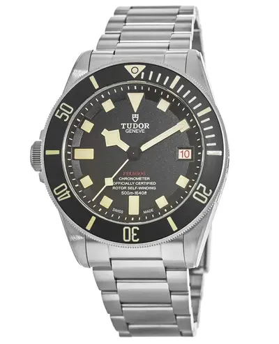 Authentic Tudor Pelagos. Left hand diver watch with automatic movement and black dial face constructed from titanium case material. Features a silver titanium bracelet equipped with a deployment foldover clasp for secure fastening. Includes a unidirectional rotating bezel characteristic of dive watches. The black dial displays hour markers of an index type in a silver tone along with minute markers around the outer rim, complemented by beige colored hands for enhanced legibility. Powered by Tudor Calibre MT5612 engine offering automatic self-winding capability and a 70-hour power reserve. Standard functions include hours, minutes, and seconds indication. The crown is screw down enhancing water resistance, protected by scratch resistant sapphire crystal glass. Case diameter measures 42mm. Comes with a solid case back construction. Rated for 500 meters or approximately 1650 feet of water resistance making it suitable for diving activities under standard conditions. Includes a 5 year WatchMaxx warranty providing assurance against manufacturing defects. Known by alternative model references including but not limited to 25610TNL-BKSTI, 25610T and the base code 25610TNL-95820.