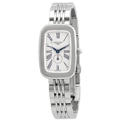 Stainless steel case with a stainless steel bracelet. Fixed polished stainless steel bezel. Silver flinque dial with blued steel hands and Roman numeral hour markers. Minute markers around the outer rim. Dial Type: Analog. One subdial displaying: small seconds. Longines caliber L178 quartz movement. Scratch resistant sapphire crystal. Pull / push crown. Solid case back. Rectangle case shape. Case dimensions: 32 mm x 22 mm. Band width: 12 mm. Fold over clasp. Water resistant at 30 meters / 100 feet. Functions: hour, minute, second. Equestrian Series. Casual watch style. Watch label: Swiss Made. Longines Equestrian Quartz Ladies Watch L6.141.4.71.6.