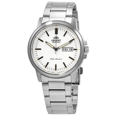 Analog automatic white dial men's watch. Stainless steel case with stainless steel bracelet and fixed bezel. Features luminous silver-tone hands, index hour markers, minute markers around the outer rim. Day of week and date display at 3 o'clock position. Equipped with Orient calibre F6922 movement containing 22 Jewels operating at a frequency of 21600 vph (approx. 7200 bph), offering approximately 40 hours power reserve. Scratch resistant mineral crystal lens, transparent case back, round shape measuring 42mm diameter and 12mm thick, band width of 21mm secured with a deployment clasp including push button release mechanism. Water resistant to 50 meters (approx. 165 feet).