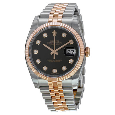 Analog, Black Dial, Automatic Movement, Sapphire Crystal, Everose Gold Case, Stainless Steel Case, Everose Gold Bracelet, Date Display at 3 O'clock Position, Fold Over Clasp, Rose Gold-Tone Hands, Diamond Markers.