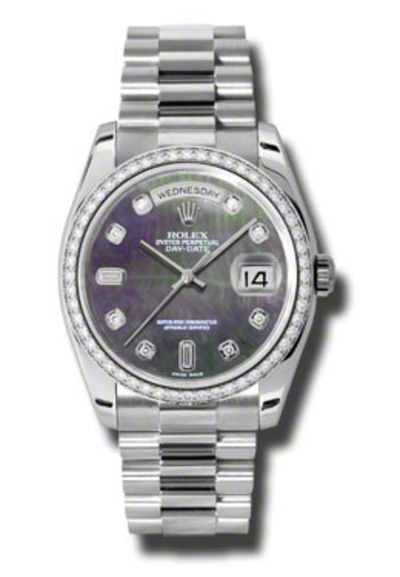 Platinum case automatic movement screw down crown. Fixed diamond bezel (52 diamonds). Black mother of pearl dial with silver tone hands and diamond hour markers. Date display at 3 o'clock position, day display at the top. Sapphire crystal scratch resistant glass. Solid case back. Round shape diameter 36 mm. President bracelet included. Water resistant to 100 meters / 330 feet. Functions: analog, hours, minutes, seconds, date, day.