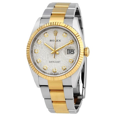 Stainless steel case with a stainless steel Rolex oyster bracelet with 18kt yellow gold center links. Fixed fluted 18kt yellow gold bezel. Silver jubilee dial with yellow gold hands and diamond hour markers. Dial Type: Analog. Date display at the 3 o'clock position. Rolex calibre 3235 automatic movement, based upon Rolex 3035, containing 31 Jewels, bitting at 28800 vph, and has a power reserve of approximately 70 hours. Scratch resistant sapphire crystal. Screw down crown. Solid case back. Round case shape. Case size: 36 mm. Water resistant at 100 meters / 330 feet. Functions: date, hour, minute, second. Datejust 36 Series. Luxury watch style. Watch label: Swiss Made. Rolex Datejust 36 Silver Jubilee Diamond Dial Mens Stainless Steel and 18kt Yellow Gold Oyster Watch 126233SJDO.