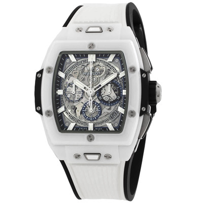 Ceramic case, white (microblasted finish) with black/two-tone rubber strap. Fixed white ceramic bezel. Analog sapphire dial featuring silver-tone hands and hour/minute markers. Date display at the 4-5 o'clock position. Chronograph functions enabled by three sub-dials showing seconds, minutes, and hours respectively. Equipped with Hublot Calibre HUB4700 Automatic movement (31 Jewels), composed of 278 parts, operates at a frequency of 36000 vph. Power reserve approx. 50 hours. Scratch resistant sapphire crystal. Luminescent coating on hands and markers for low-light visibility. Screw-down crown with transparent case back. Water resistant to 100 meters / 330 feet. Tonneau shaped, 42mm diameter. Includes deployant buckle clasp. Swiss Made label.