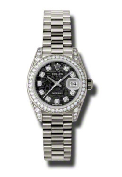 Automatic mechanical movement, scratch resistant sapphire crystal glass. White gold diamond-set case. Rolex President bracelet in white gold. Fixed black jubilee dial accented by diamond hour markers and silver-tone hands. Date display at the 3 o'clock position. Solid case back with concealed crown clasp. Water resistance up to 100 meters / 330 feet. Includes functions for hours, minutes, seconds, and date. Ladies watch features a round case shape measuring 26 mm in diameter. Luxury analog diamond watch Swiss Made.