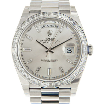 Platinum case with a silver-tone platinum Rolex President bracelet featuring screw down crown and concealed clasp. Fixed bezel set with diamonds, silver dial with baguette diamond hour markers and minute markers at the outer rim. Analog dial displaying date at 3 o'clock and day of the week at 12 o'clock. Powered by Rolex Calibre 3255 automatic movement containing 31 jewels beating at 28800 vph, ensuring chronometer accuracy with approximately 70 hours power reserve. Equipped with scratch-resistant sapphire crystal. Water resistant to 100 meters / 330 feet.