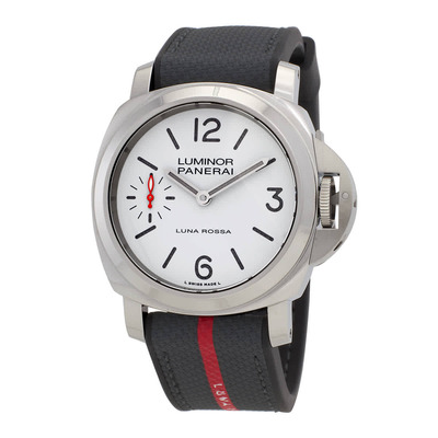 Silver-tone stainless steel case, bi-material grey luna rossa band. Fixed silver-tone stainless steel bezel. Analog white dial with silver-tone hands and Arabic numeral hour markers; luminescent for night-time reading. Includes small second subdial function. Equipped with Panerai Calibre P.6000 hand wind movement containing 19 jewels, operating at a frequency of approximately 21,600 vph (beats per hour) and offering a power reserve of about 72 hours. Features scratch-resistant sapphire crystal. Solid case back. Round shape with case diameter measuring 44 mm. Water resistant up to 100 meters / 330 feet depth. Watch functions include: analog time display for hours, minutes, and small seconds; bi-material band in grey luna rossa material combined with silver-tone metal elements as appropriate. Luminor Luna Rossa collection series. Swiss Made quality.