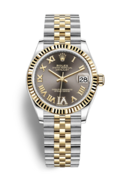 Ladies automatic watch. Analog dial displaying hours, minutes, seconds and date at the 3 o'clock position. Case size: 31mm, constructed from stainless steel and features an 18kt yellow gold finish. Equipped with a screw-down crown and solid case back. Comes with a jubilee bracelet made of both stainless steel and 18kt yellow gold. Includes fixed-fluted bezel and scratch-resistant sapphire crystal. Movement: Rolex Calibre 2236 automatic, offering a 55-hour power reserve. Water resistant up to 100 meters / 330 feet.