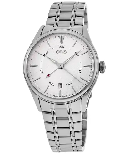 Automatic movement, Oris Caliber 755. Polished stainless steel case and bezel. Pointer day/date display at 6 o'clock on guilloche silver dial with luminous hands/index markers. Water resistant to 50 meters (165 feet). Includes WatchMaxx warranty.