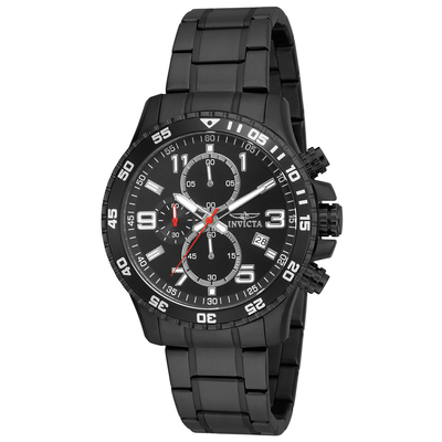 Black stainless steel case with a gunmetal stainless steel bracelet. Uni-directional rotating gunmetal stainless steel bezel. Black dial with silver-tone hands and index-Arabic numeral hour markers. Minute markers around the outer rim. Dial Type: Analog. Luminescent hands and markers. Date display at the 4 o'clock position. Chronograph - three sub-dials displaying: 60 second, 60 minute and 1/10th of a second. Hattori Caliber VD57 quartz movement. Scratch resistant Flame Fusion crystal. Screw down crown. Solid case back. Round case shape, case size: 45 mm, case thickness: 12.5 mm. Band width: 22 mm, band length: 7.75 inches. Fold over clasp. Water resistant at 50 meters / 165 feet. Functions: chronograph, date, hour, minute, second. Specialty Series. Casual watch style. Watch label: Japan Movt. Invicta Specialty Chronograph Quartz Black Dial Mens Watch 16933.