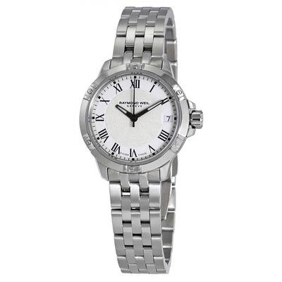 Stainless steel case with a stainless steel bracelet. Fixed stainless steel bezel. White dial with luminous black hands and Roman numeral hour markers. Minute markers around the outer rim. Dial Type: Analog. Luminescent hands. Date display at the 3 o'clock position. Quartz movement. Scratch resistant sapphire crystal. Screw down crown. Solid case back. Round case shape, case size: 30 mm. Case thickness: 7.35 mm. Fold over clasp with a push button release. Water resistant at 100 meters / 330 feet. Functions: date, hour, minute, second. Dress watch style. Watch label: Swiss Made. Raymond Weil Tango White Dial Ladies Watch 5960-ST-00300.