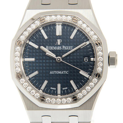 Silver-tone stainless steel case set with diamonds, featuring a silver-tone stainless steel bezel fixed with 8 screws and diamond setting. Silver-tone stainless steel bracelet equipped with folding clasp. Blue analog dial displaying the grande tapisserie pattern at the center, accented by silver-tone hands and index hour markers for both 12/24h display options. Minute markers are present on the outer bezel rim. Dial includes luminescent elements for hours and minutes. A date function is displayed through a small aperture positioned at approximately the 3 o'clock mark. Powered by an automatic movement, Calibre 3120 with 40 jewels containing 280 parts operating at 21600 vph frequency; approximate power reserve duration of 60 hours. Sapphire crystal bezel insert and main display crystal are both scratch resistant. Screw down crown mechanism. Transparent case back revealing the movement finish. Octagon shaped case measuring 37 mm in diameter with a thickness of approximately 9.8 mm. Water resistant to depths exceeding 50 meters or up to 165 feet.