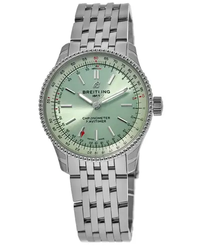 Brand new authentic Breitling Navitimer Automatic 36 featuring a green dial, stainless steel case and bracelet. Equipped with an automatic Breitling Caliber 17 movement showing hours, minutes, seconds. Includes bi-directional rotating bezel and scratch-resistant sapphire crystal. Round case measuring 36mm diameter and 11.4mm thick with solid case back. Water resistant to 30 meters (approx. 100 feet). Comes with a standard 2-year WatchMaxx warranty.