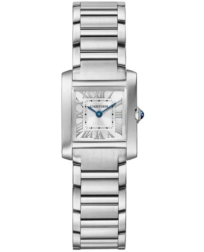 A brand new authentic Cartier Tank Francaise women's watch with a small size, silver dial featuring blued steel sword-shaped hands. Includes Roman numeral hour markers and minute markers around the inner rim on the case band (brown leather strap). Equipped with a faceted synthetic cabochon spinel crown and a scratch-resistant sapphire crystal lens. Powered by battery-operated quartz movement offers functions for hours, minutes only. The rectangular stainless steel case measures 25.7mm x 21.2mm in thickness at 6.8mm, featuring a fixed bezel, solid case back, and is fitted with a folding clasp bracelet made of brushed stainless steel.