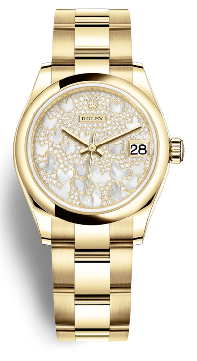 A luxury ladies' watch from Rolex, model Datejust, featuring an 18kt yellow gold case and bracelet. The dial includes a mother-of-pearl finish with diamond pave setting. Powered by the Calibre 2236 automatic movement containing 31 jewels beating at 28800 vph (4Hz), offering about 55 hours power reserve. Includes date display at the 3 o'clock position, analog functions for hours, minutes and seconds. Water resistant up to 100 meters / 330 feet depth.