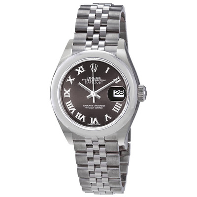 A luxury ladies' watch from the Rolex Lady Datejust series featuring an automatic movement, grey dial with Roman numeral hour markers and silver-tone hands, stainless steel case and jubilee bracelet. Equipped with a fixed domed stainless steel bezel displaying seconds at center, date function visible through an aperture at the 3 o'clock position. Powered by the Rolex Calibre 2236 automatic mechanical movement based on the reference 2235, containing 31 jewels and operating at 28800 vph with a power reserve of approximately 70 hours. Features sapphire crystal for scratch resistance, screw-down crown mechanism, solid case back, round case shape measuring 28mm in diameter, fold-over clasp closure, and is rated water resistant to 100 meters (330 feet).