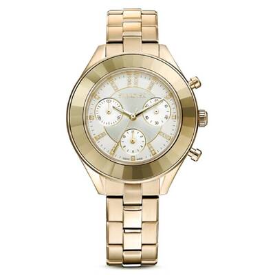 Champagne gold-tone PVD stainless steel case and bracelet. Fixed champagne gold-tone PVD stainless steel bezel. Silver dial with champagne gold-tone PVD hands and crystal hour markers. Minute markers around the outer rim. Dial Type: Analog. Chronograph - three sub-dials displaying: 60 second, 30 minute and 12 hour. Quartz movement. Pull / push crown. Solid case back. Round case shape, case size: 37 mm. Deployment with push button release clasp. Water resistant at 50 meters / 165 feet. Functions: chronograph, hour, minute, second. Octea Lux Sport Series. Sport watch style. Watch label: Swiss Made. Swarovski Octea Lux Sport Chronograph Quartz Crystal Silver Dial Unisex Watch 5610517.