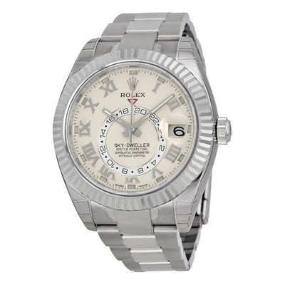 18K white gold case, luminous silver-tone hands with Roman numeral hour markers on ivory dial, bi-directional rotating bezel in yellow gold, annual calendar function including date display through sapphire crystal window, subdials for hours, minutes (including month indicator), and second timezone functions, automatic movement powered by Calibre 9001 mechanism with 72-hour power reserve, sapphire crystal resistant to scratches, screw-down crown, solid case back, round shape measuring 42 mm in diameter, water resistance up to 100 meters or 330 feet, Oyster clasp closure.