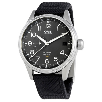 Stainless steel case, black textile strap. Fixed coin edge bezel, grey dial featuring luminous silver-tone hands and Arabic numeral hour markers plus minute markers and prominent 24-hour markers around the outer rim. Analog display with date at the 3 o'clock position, small seconds sub-dial visible through the sapphire crystal glass. Oris Calibre 748 automatic movement powering analog GMT functions including second time zone setting via rotating bezel clasp (requires a separate 5th screw to operate the quick-set function typically found on the side of the case). Movement is based upon Sellita SW220-1, includes 28 jewels and operates at 28800 vph. Approximate power reserve: 38 hours. Scratch resistant sapphire crystal. Screw down fixed bezel. Transparent screw-in case back. Round case shape measuring 45 mm in diameter with a band width of 22 mm. Equipped with a fold over clasp. Water resistant to 100 meters / 330 feet (diving water resistance). Swiss Made label.