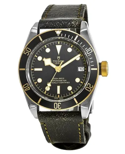 Brand new authentic Tudor Black Bay 41. Features a stainless steel case brushed and polished with yellow gold accents on the aged black leather strap bezel insert. Includes an automatic self-winding MT5612 COSC certified movement with 70-hour power reserve, date function, luminous hour markers, yellow gold hands, sapphire crystal glass resistant to scratches, folding clasp closure system, and is rated for 200 meters water resistance (660 feet). Comes in an alternative model reference M79733N-0007.