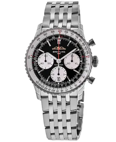 Authentic Brand New Breitling Navitimer B01. 41mm stainless steel case, sapphire crystal scratch resistant face. Features a black dial with silver tone hands and indices marked both hour and minute including outer minute markers; three sub-dials displaying chronograph minutes, seconds (60 sec), hours (12 hr) plus date at 6 o'clock powered by automatic Breitling Caliber 01 movement with 70-hour power reserve. Includes bi-directional rotating slide rule bezel on a stainless steel bracelet band. Water resistant to 30 meters / 100 feet depth and comes complete with its original box, papers, warranty certificate (5 year WatchMaxx), ensuring precision timekeeping functions for date, hours, minutes, seconds, chronograph start/stop/preset.