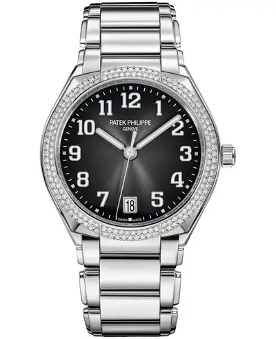 Brand New Authentic Patek Philippe Twenty 4 Automatic Diamond Women's Luxury Watch Model 7300/1200A-010. Polished Stainless Steel Case With a Diamond-set Bezel case with Polished Stainless Steal Bracelet watch band. Deployment clasp. Fixed bezel. Dial description: White Gold Luminescent Hands and Arabic Hour Markers With the Date Displayed at 6, on a Grey Sunburst Dial. dial. Automatic Self Winding movement. Powered by Patek Philippe Calibre 324 S C engine. Watch functions: Date, Hour, Minute, Second. Screw in crown. Scratch Resistant Sapphire crystal. Round case shape. Case size: 36mm. Case thickness: 10.05mm. Transparent case back. 30 Meters - 100 Feet water resistant. 2 year WatchMaxx warranty. Also known as model: 73001200A010.