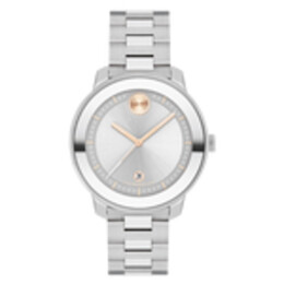 Silver-tone stainless steel case and bracelet. Fixed silver-tone stainless steel bezel. Silver-tone dial with rose gold-tone hands and index hour markers. Minute markers around the outer rim. Dial Type: Analog. Luminescent hands and markers. Date display at the 6 o'clock position. Quartz movement. Solid case back. Round case shape, case size: 38 mm. Fold over clasp with a safety release. Water resistant at 30 meters / 100 feet. Functions: date, hour, minute, second. Bold Verso Series. Casual watch style. Watch label: Swiss Made. Movado Bold Verso Quartz Silver Dial Unisex Watch 3600869.
