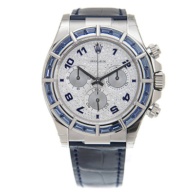 Leather Strap, Fixed Blue Ruby Tachymeter Bezel, Diamond Set Analog Dial (Roman Numerals), Minute Markers, Luminescent Hour/Minute Hands, Automatic Movement Calibre 4130 with Chronometer Accuracy and 72-Hour Power Reserve, Sapphire Crystal, Screw-Down Crown, Solid Case Back, Round Case Shape, Size: 40mm, Tang Clasp, Water Resistant to 100m (330ft), Functions: Chronograph, Hour, Minute, Second, Chronometer. Luxury Swiss Made Watch.
