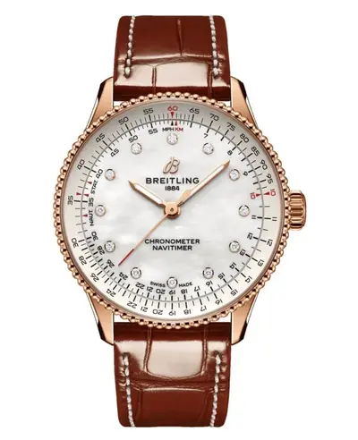 Polished 18k Rose Gold case featuring a Mother of Pearl dial with Diamond hour markers and Luminous Rose Gold hands including a Tachymeter scale. Brown Alligator Leather strap equipped with a Folding clasp. Swiss Automatic Chronometer movement powered by Breitling caliber 17 engine, offering 38 hours power reserve and functions for Hour, Minute, Second, Speed, and Power Reserve. Round case measuring 36mm diameter and 11.4mm thickness, solid case back, scratch-resistant Sapphire crystal. Water resistant to 30 meters (approx. 100 feet).
