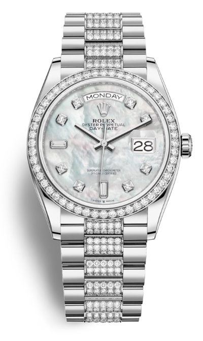 Rolex Calibre 3255 automatic movement with 31 jewels and 28800 vph beating rate. Power reserve approx 70 hours. Analog display dial made of mother of pearl accented by diamond hour markers. Fixed diamond set bezel crafted in white gold. White gold case. Diamond set president bracelet folding clasp. Scratch resistant sapphire crystal. Screw down crown. Solid case back. Round shape, 36 mm diameter size. Water resistant to 100 meters / 330 feet depth. Functions: day display at the 9 o'clock position, date display at the 3 o'clock position, hours, minutes, seconds. Luxury analog watch style with Swiss Made label.