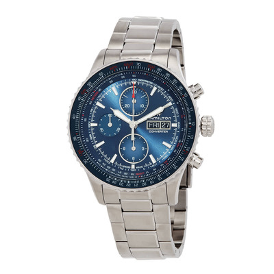 Sport watch, analog dial type. Features a 44mm round case with silver-tone stainless steel construction and bracelet along with a bi-directional rotating blue bezel made of the same material. The blue dial includes luminous hands and index hour markers for enhanced readability in low light. A tachymeter scale is present on the outer rim. Equipped with day-of-week and date display at the 3 o'clock position, indicated by silver-tone hands and indexes respectively. Powered by Hamilton Calibre H-21-Si automatic movement boasting a 60-hour power reserve. Secured by screw-down crown access. Features a solid case back and sapphire crystal for scratch resistance and clarity. Band width is 22mm with fold over clasp closure system. Water resistant capabilities reach depths of 100 meters or 330 feet, suitable for various water activities. Includes chronograph functions alongside standard hour, minute, second timekeeping. Belongs to the Khaki Aviation Series and carries Swiss Made label.