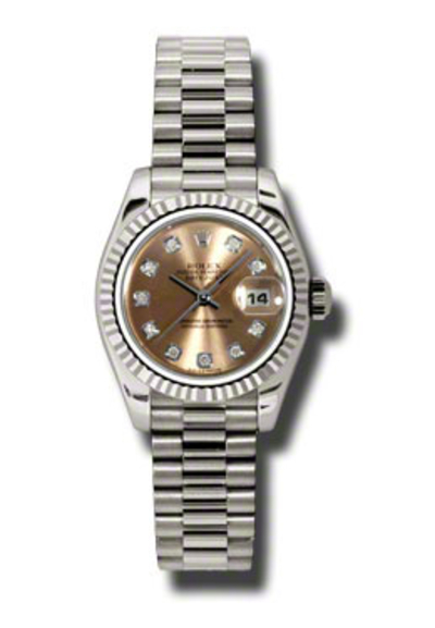 White gold case, white gold President bracelet with concealed clasp. Fixed fluted bezel in white gold. Pink dial featuring silver-tone hands and diamond hour markers (analog display). Date at the 3 o'clock position. Automatic mechanical movement. Scratch-resistant sapphire crystal lens. Screw-down winding crown. Solid case back. Round shape, diameter 26 mm. Water resistant to 100 meters/330 feet. Functions include hours, minutes, seconds and date indication.