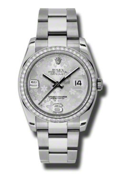 Analog watch with silver floral dial, featuring Arabic hour markers and luminous silver-tone hands. Equipped with an automatic movement (Perpetual). Sapphire crystal provides scratch resistance. Includes screw-down crown and fixed 18k white gold bezel set with diamonds. Stainless steel case paired with a stainless steel Oyster bracelet equipped with Oysterclasp. Date function displayed at the 3 o'clock position. Water resistant to 100 meters / 330 feet. Round shape, 36 mm diameter.
