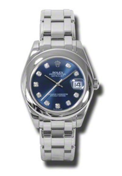 18kt white gold case, fixed domed bezel also in 18k white gold. Analog blue diamond dial with silver-tone hands and hour markers. Date display at the 3 o'clock position. Rolex Calibre 2235 automatic movement with 31 jewels, beats per second (b.p.s.) of 28800, approx. 48-hour power reserve. Scratch-resistant sapphire crystal lens. Screw-down winding/crown set in white gold. Round case shape measuring 34 mm diameter. Concealed crown clasp closure. Water resistant to 100 meters / 330 feet (approximate). Chronometer certified chronograph function, hour, minute, second and date display functions present. Luxury ladies' watch with Swiss Made label.