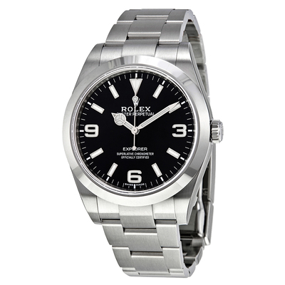 Silver-tone stainless steel case with a silver-tone stainless steel rolex oyster bracelet. Fixed domed silver-tone stainless steel bezel. Black dial with silver-tone Mercedes-logo, sword, and Breguet-style shape hands and Arabic numeral and index hour markers. Arabic numerals mark the 3, 6 and 9 o'clock positions. Minute markers around the outer rim. Dial Type: Analog. Luminescent hands and markers. Rolex Calibre 3000 Automatic movement, based upon Rolex 3035, containing 27 Jewels, bitting at 28800 vph, and has a power reserve of approximately 42 hours. Scratch resistant sapphire crystal. Screw down crown. Solid case back. Round case shape, case size: 39 mm. Oysterlock clasp. Water resistant at 100 meters / 330 feet. Functions: hour, minute, second, chronometer. Explorer Series. Luxury watch style. Watch label: Swiss Made. Pre-owned Rolex Explorer Automatic Chronometer Black Dial Mens Watch 214270BKASO-3.