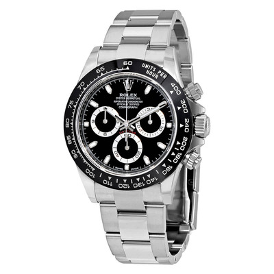 Item: 116500BKSO, Model: Cosmograph Daytona, Case Material: 904L Stainless Steel, Bracelet: Oyster with screw-down clasp (Rolx), Dial Color: Black Lacquer with Luminous Markers and Hands, Bezel: Fixed Bicolor Cerachrom Tachymeter Insert, Crystal: Scratch-Resistant Sapphire Glass, Movement: Rolex Caliber 4130 Automatic Chronometer Movement with 72-Hour Power Reserve, Functions: Analog Display (Hours, Minutes, Seconds), Date Function at the 6 o'clock position, Chronograph Sub-Dials: 60-second counter, 30-minute counter and 12-hour tachymeter register. Case Diameter: 40mm, Water Resistance: 100 meters / 330 feet.