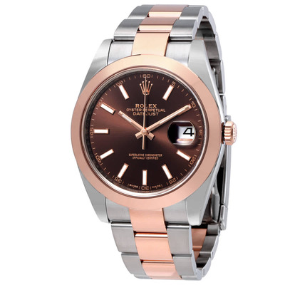 The Rolex Datejust 41 features a chocolate brown dial, stainless steel case with an 18K Rose Gold-tone Oyster bracelet featuring center links in 18K Everose gold. Equipped with the Calibre 3235 automatic movement and scratch-resistant sapphire crystal, it includes date functionality at the 3 o'clock position and is water resistant to 100 meters. This luxury Swiss watch has luminous hands, an analog dial type, round case shape of size 41mm, screw-down crown, solid case back.