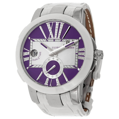 A ladies' watch featuring a purple dial, diamond-filled Roman numeral hour markers, and a white ceramic bezel. Silver-tone stainless steel case with date display at the 2 o'clock position, subdial for seconds, analog display type. Equipped with Ulysse Nardin Calibre UN-24 Automatic movement containing 34 jewels beating at 28800 vph, providing a power reserve of approximately 42 hours. Comes with a transparent sapphire crystal glass, screw-down crown, and round case measuring 40 mm in diameter and 12.8 mm thick. Features include GMT function, second time zone indication, hour, minute, and second hands. Water resistant up to 50 meters (165 feet). Luxury Swiss-made watch.