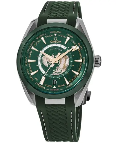 A brand new authentic Omega Seamaster Aqua Terra men's watch with model number 220.32.43.22.10.001 and alternative designation 22032432210001. Features a Master Co-Axial GMT Worldtimer automatic movement, which is Swiss Automatic and Chronometer certified. Equipped with a 60-hour power reserve via Caliber 8938 engine. Includes date functionality at the 6 o'clock position, 24-hour sub-dial for day/night indication, a laser-ablated Earth image indicating north pole in the center of the dial, and stick hour markers with luminous yellow gold hands on a green dial. Comes with a ceramic bezel, transparent case back, and is water resistant to 150 meters (495 feet). Constructed from brushed and polished stainless steel case paired with a stainless steel rubber strap featuring deployment clasp with push button activation. The overall case shape is round measuring 43mm in diameter and 14.10mm thick. Includes scratch-resistant sapphire crystal lens for the display surface.