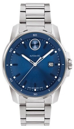 Silver-tone stainless steel case and bracelet. Fixed silver-tone stainless steel bezel. Blue dial with silver-tone hands and index hour markers. Minute markers around the outer rim. Dial Type: Analog. Luminescent hands and markers. Date display at the 3 o'clock position. Automatic movement. Scratch resistant sapphire crystal. Transparent case back. Round case shape, case size: 43 mm. Fold over clasp with a safety release. Functions: date, hour, minute, second. Bold Verso Series. Casual watch style. Watch label: Swiss Made. Movado Bold Verso Automatic Blue Dial Mens Watch 3601051.