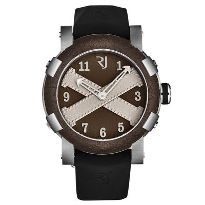 Men's luxury analog automatic watch featuring a silver-tone stainless steel case, fixed brown bezel, and black rubber strap. Equipped with Romain Jerome Calibre RJ2001 mechanical self-winding movement (calculated at 28,800 vph). Brown dial displays silver-tone hands and Arabic numeral hour markers. Protected by scratch-resistant sapphire crystal glass. Includes a pull/push crown and solid case back. Round case measures 46 mm in diameter with a thickness of 14.5 mm; band width is 22 mm and length adjustable up to approximately 8 inches using the tang clasp. Water resistant to 30 meters (approx. 100 feet).