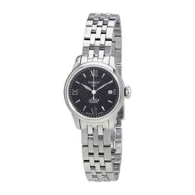 Stainless steel case equipped with a stainless steel bracelet, fixed bezel also in stainless steel material. Analog watch featuring a black dial accented by silver-tone leaf-style hands along with Roman numeral hour markers at the 3,6,9,12 positions; minute indexes around the outer rim. Luminescent coating on both hands and dial markers for enhanced visibility in low light conditions. Date display positioned at the 3 o'clock location. Powered by ETA Caliber 2671 automatic movement containing 25 jewels with a frequency of 28800 vph, offering approximately 38 hours power reserve. Secured scratch-resistant sapphire crystal lens. Operated via pull/push crown for winding and setting functions; solid case back included. Classic round shape measuring 25.3 mm in width and 8.1 mm thick. Band features a 12 mm width secured by butterfly clasp closure mechanism. Water resistant up to 30 meters or 100 feet depth. Functions display the current hour, minute, second, and date information via analog subdials or directly on the main dial as appropriate for this model. Watch belongs to Le Locle Series collection, manufactured in Switzerland with Swiss Made labeling. Suitable for casual daily wear.
