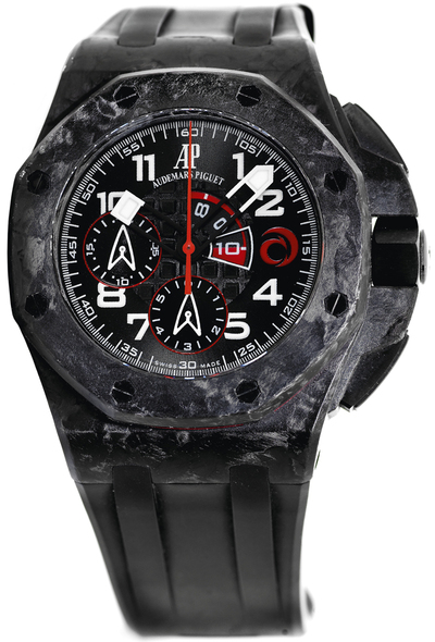 Silver-tone forged carbon case with fixed blue bezel and black rubber strap. Features a black dial equipped with luminous hands, Arabic numeral hour markers, minute outer track, and luminescent indices for enhanced visibility in darkness. Analog dial type powered by the Audemars Piguet Calibre 2326/2848 automatic movement containing 50 jewels, operating at a frequency of 28800 vph (5Hz), offering approximately 60 hours power reserve. Equipped with three sub-dials: one for 20-minute chronograph function, another for 10-minute countdown timer, and the third showing elapsed time up to 6 hours. Includes flyback complication, rattrapante split-seconds functionality, hour, minute, and small second hands. Scratch resistant sapphire crystal display window, screw-down crown, solid case back with octagonal shape measuring 44mm diameter and 14.3mm thickness. Secured by a tang clasp. Water resistant to 100 meters / 330 feet depth.