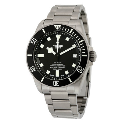 Grey titanium case and bracelet. Features a grey titanium uni-directional rotating bezel with black ceramic insert, an analog black dial marked by luminous silver-tone hands and index hour markers, minute markers around the outer rim, scratch-resistant sapphire crystal, screw-down crown, solid case back, round shape measuring 42 mm in diameter and 14 mm thick. Includes a date display at 3 o'clock powered by Tudor Calibre MT5612 automatic movement with 70-hour power reserve. Band width is 21 mm secured by deployment clasp with push button release mechanism. Water resistant to 500 meters or 1650 feet, making it suitable for professional diving conditions. Luxury Swiss Made watch.