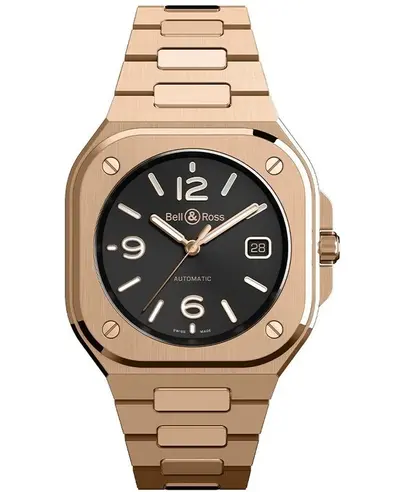 A men's watch from Bell & Ross featuring a 40mm rose gold case, black dial with rose gold tone hands and Arabic numeral hour markers. Equipped with an automatic movement (Calibre BR-CAL.321), scratch-resistant sapphire crystal glass, screw-in crown, date function, and water resistance up to 100 meters. Square case shape with solid case back.