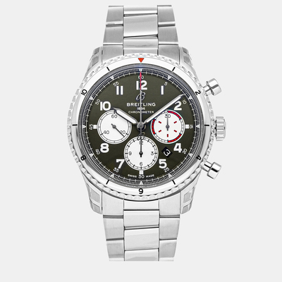 Discover the Breitling Aviator, a sophisticated men's watch combining Swiss precision and timeless style. Crafted from polished green stainless steel, this automatic movement timepiece features a classic design in a 43mm case size. It boasts precise chronometer-certified accuracy with its self-winding mechanism ensuring reliable performance without battery change requirements. The elegant dial provides a clean presentation for reading the time, making it suitable for formal occasions or daily wear.